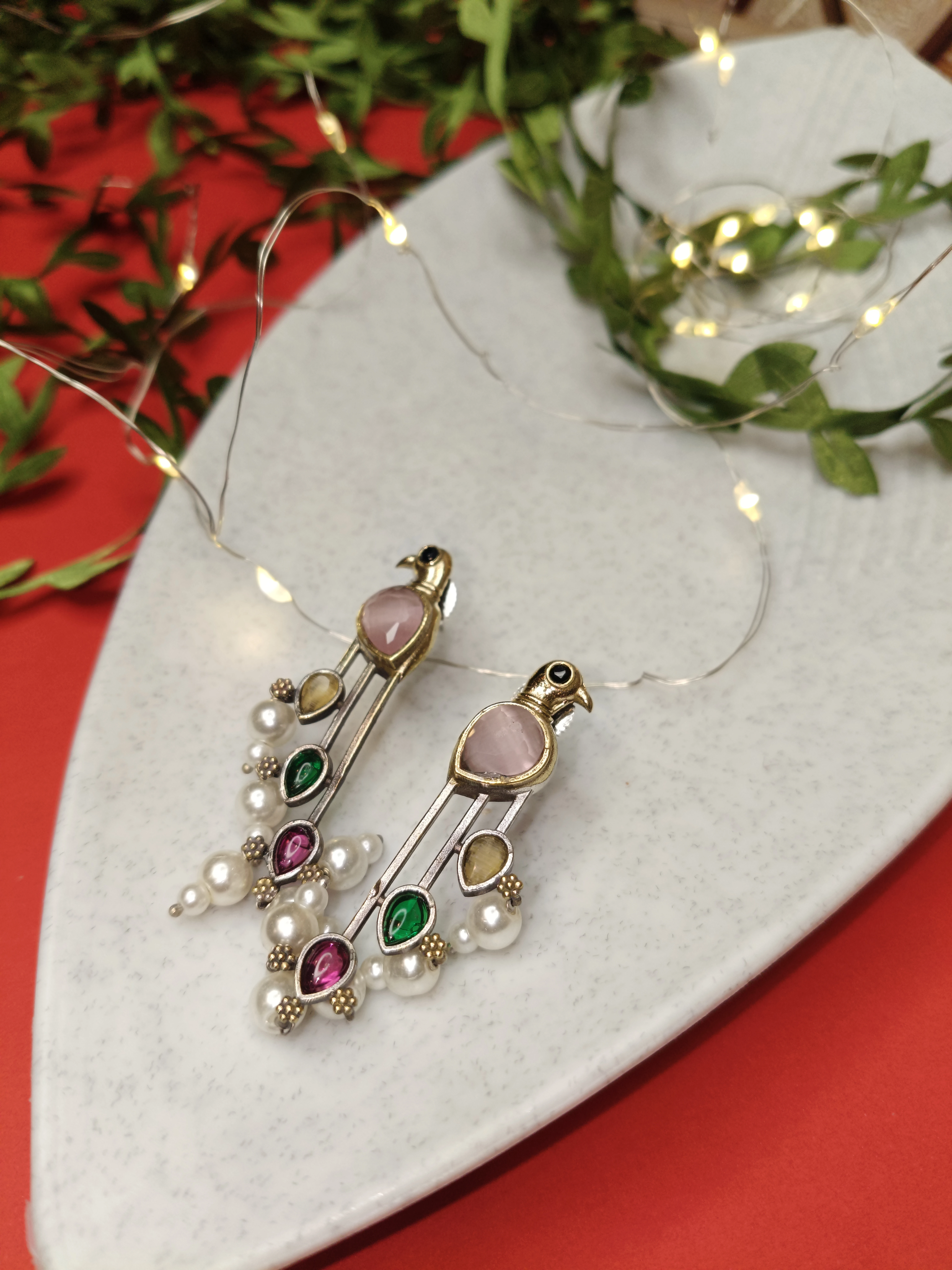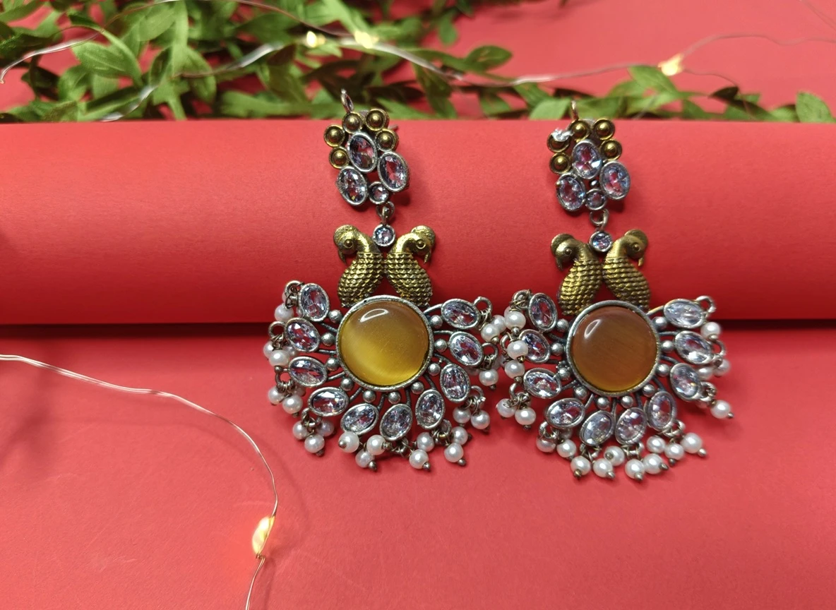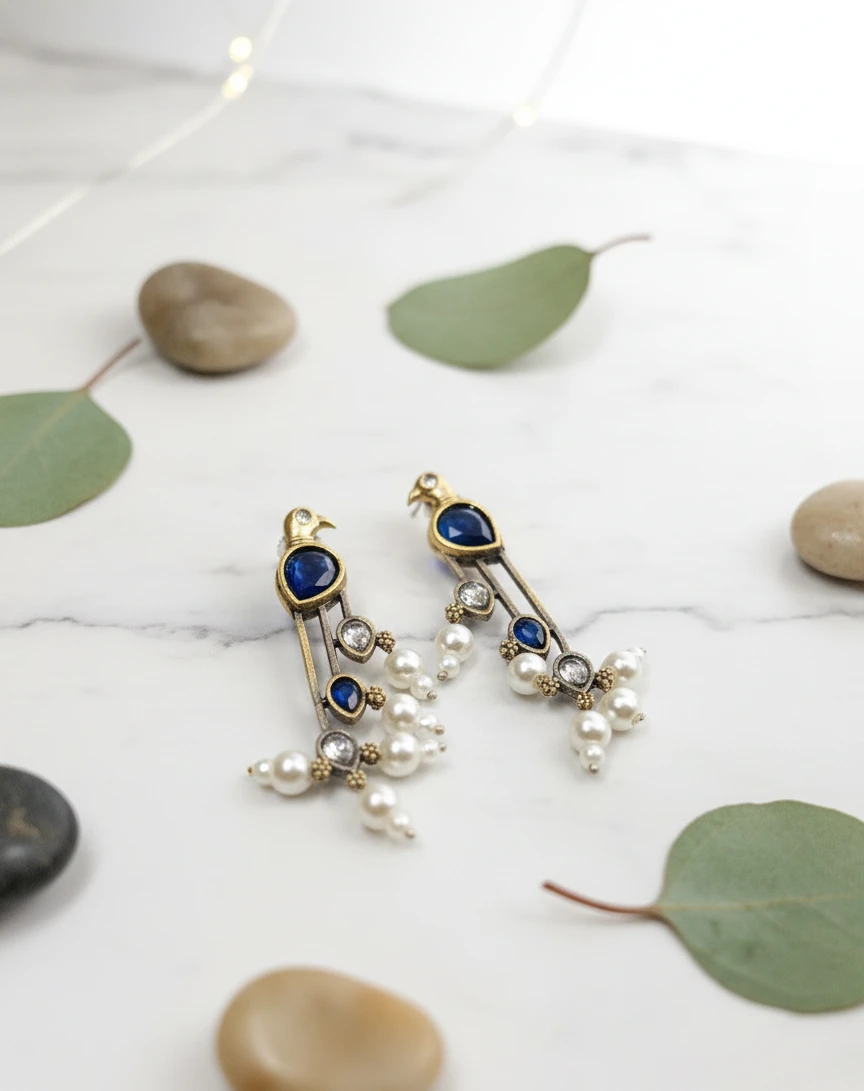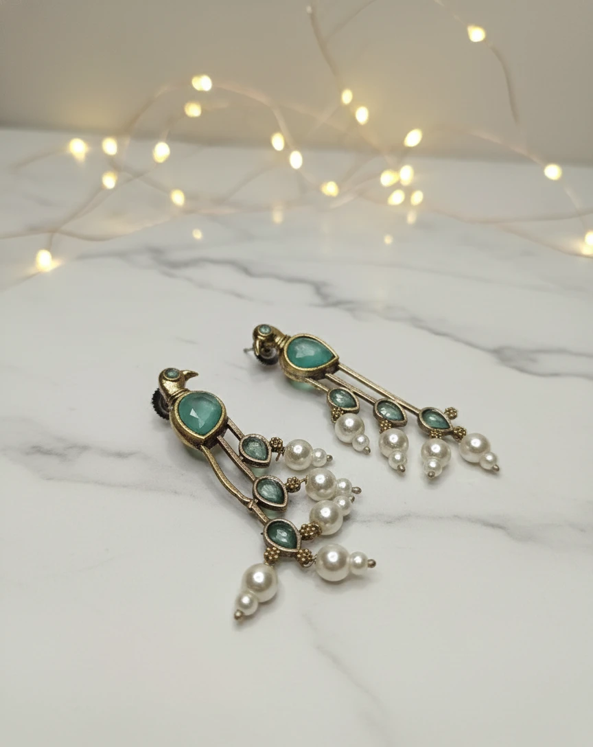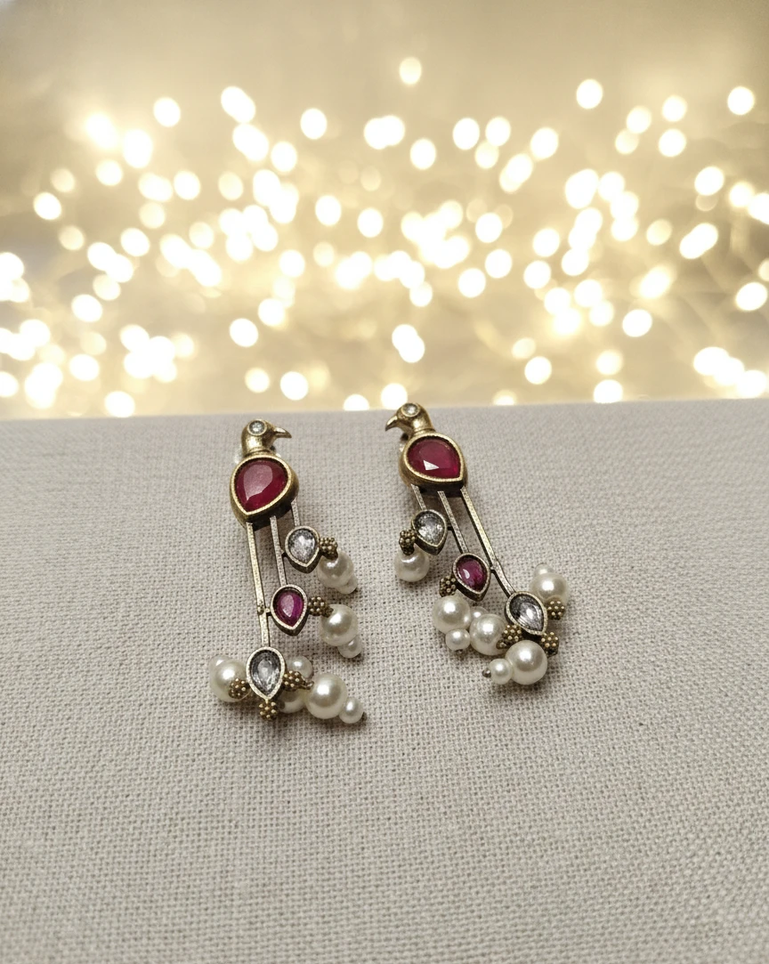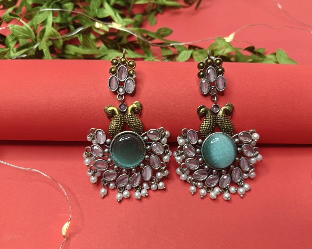 Designed for the modern woman who loves a touch of vintage charm, these earrings are adorned with sparkling multicolor stones—including emerald blue, onyx black, and crystal white accents—finished with a delicate seed pearl drop at the bottom. The unique dual-tone finish (Oxidized Silver & Gold Plating) makes them versatile enough to pair with both traditional ethnic wear and contemporary western outfits.
