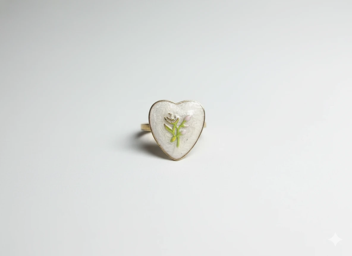 Capture the essence of vintage romance with this exquisite Rose Enamel Heart Ring. This piece is a celebration of delicate craftsmanship and heartfelt design, making it the perfect addition to your fine jewelry collection or a meaningful gift for someone special.